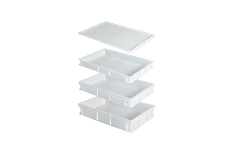 Caixa de fermentação para bolinhas de massa. Empilhável, e oferece perfeita vedação para evitar a entrada do ar que seca massa. Feita em polipropileno para uso alimentar. Dimensões externas: 60 x 40 x 7 cm